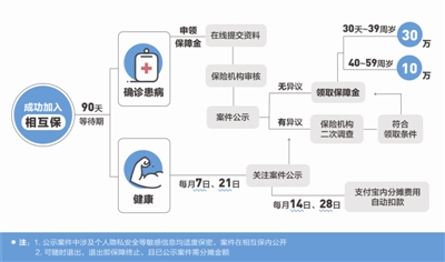 根据《相互保规则》,“相互保”是将“具有相同风险保障需求的蚂蚁会员团结在一起,以共担风险的方式为会员提供健康保障的互助共济机制”。该产品规定,18周岁以上未满59周岁、芝麻分650分以上的蚂蚁会员无需交费,即可申请加入该保障计划,获得包括恶性肿瘤在内的100种大病保障,获准加入的成员还可以再为自己的未成年子女申请加入。加入的成员即为被保险人,所获保障额度以年龄划段区分:不满40周岁的为30万元,40周岁到59周岁的为10万元。被保险人一旦罹患约定疾病,由所有加入相互保的成员共同分摊所需支付的保障金及由此产生的管理费。
