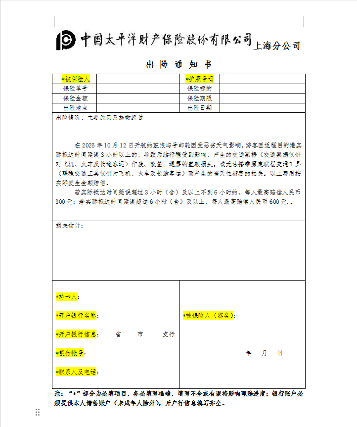 出险通知书每人一份,被保险人为游客姓名,标记 * 部分为必填部分,其他不用填,开户银行栏必须填全支行信息。