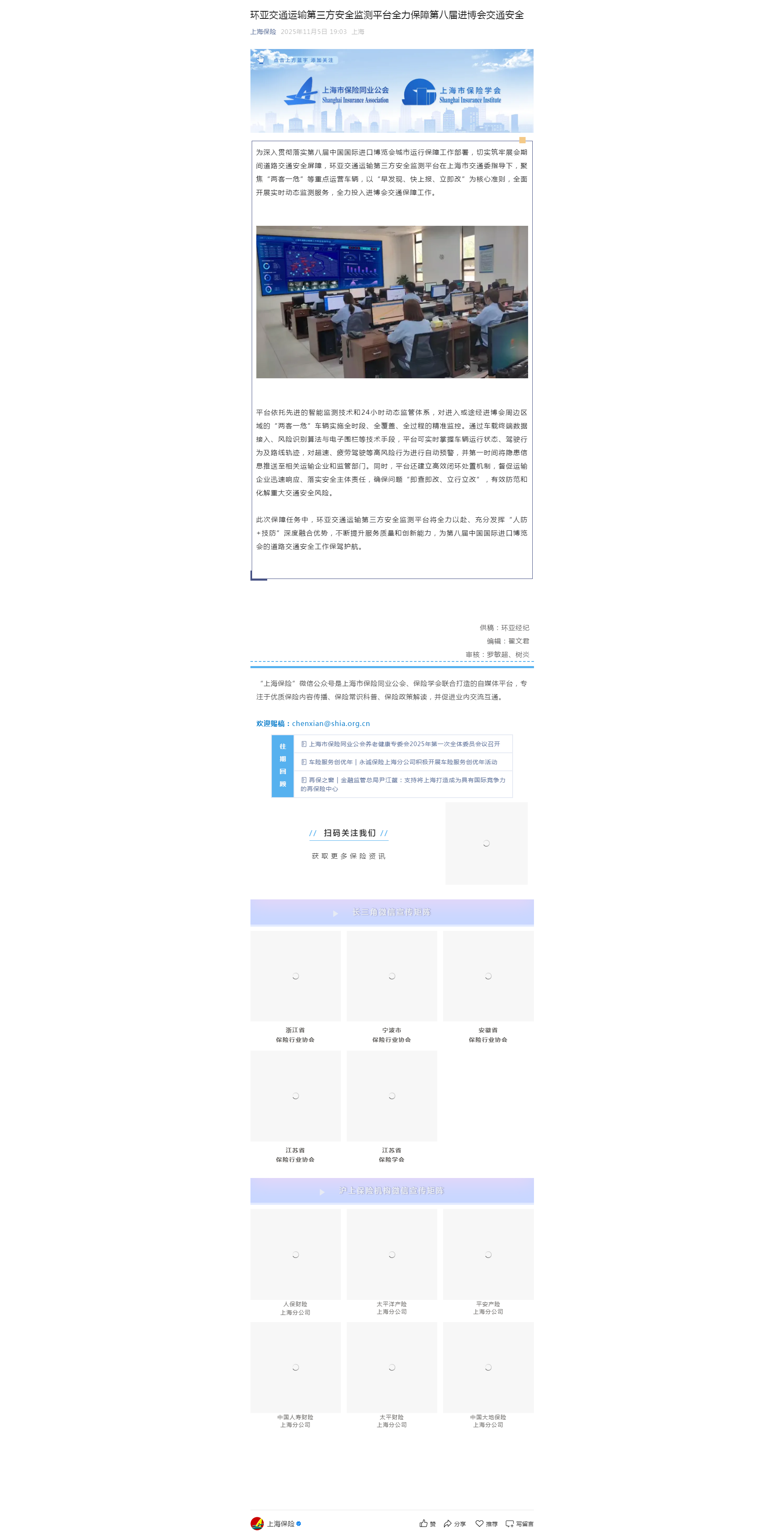 《上海保险》对环亚保障进博会交通安全的报道:环亚交通运输第三方安全监测平台全力保障第八届进博会交通安全(2025-11-6)